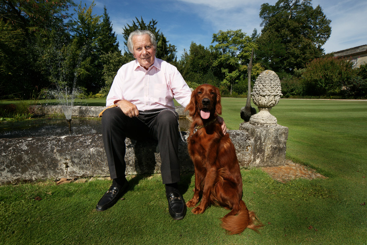 Anthony Barton sits with Doune in front of the water garden at Château Langoa Barton. His dog depicts the youthful exuberance with which Anthony still makes his wine although 80 this year. The colour saturation of the image reflects the richness and power of the wine of Château Léoville Barton.