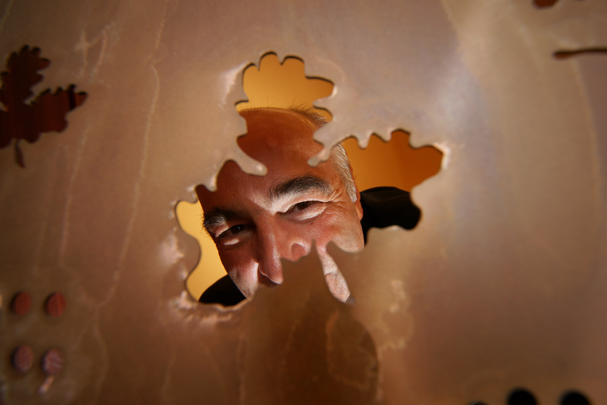 Bruno Borie is photographed behind one of the doors in the tasting rooms at Château Ducru-Beaucaillou. This perforated design of the vines runs throughout the Château, and echoes his love for contemporary art of which there is plenty at Château Ducru-Beaucaillou. His eyes depict his exuberant nature which is reflected in the wine.