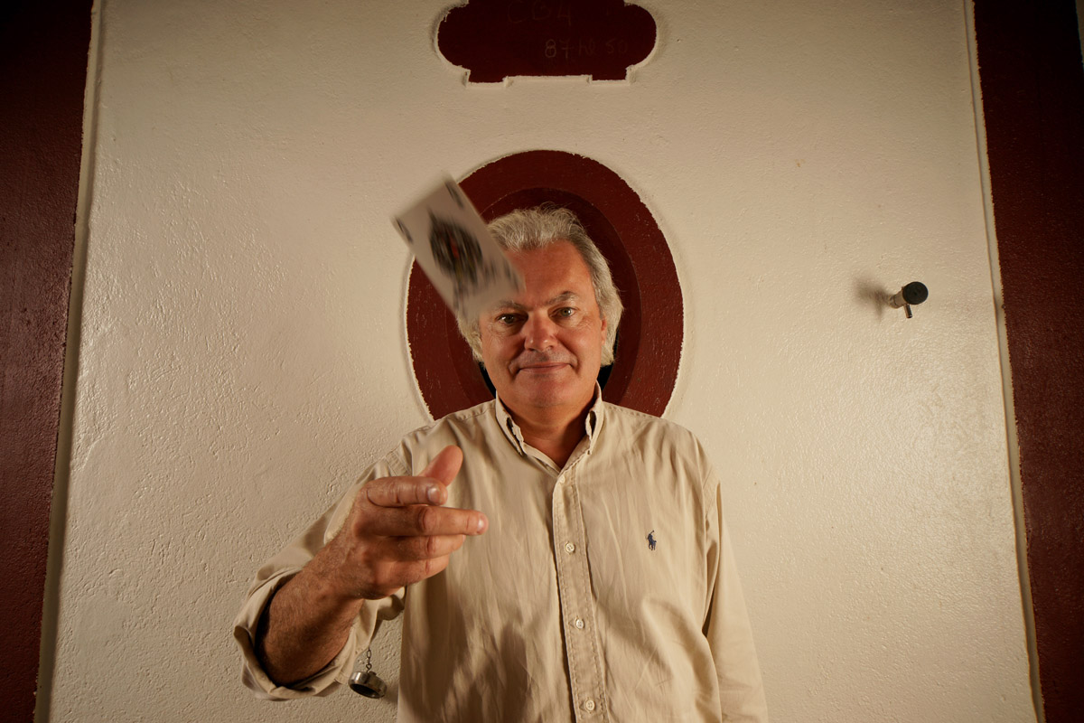 Hubert de Bouard stands in front of a concrete wine vat whose rondelle forms a halo around his head. Inspired by his Burgundian training, he changed the method of concrete vat to bottle, to add in the barrel stage at Angelus. He throws us an “Ace of Spades" to represent the terroir, the “A” for Angelus, and the connection with James Bond, who in Casino Royale orders a bottle of Angelus 1982.