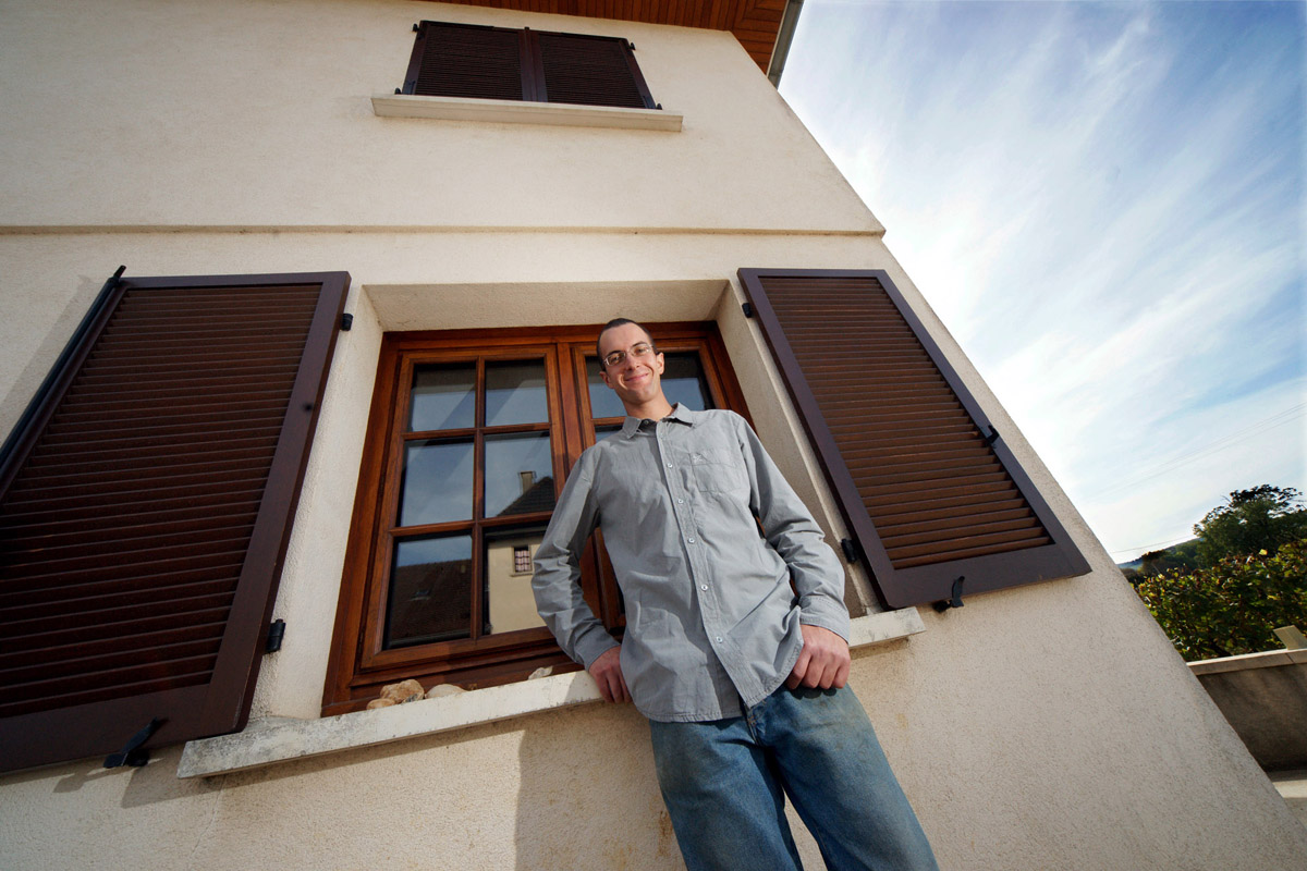 Raphaël Coche-Dury took over the winemaking from his father in 2007. He stands in front of his family home which was built in 1980 by his father. The winery is reflected in the window and the vines can be seen on the right. The clouds in the sky spread out like a star burst, showing the new star that Raphaël has become at Coche-Dury.