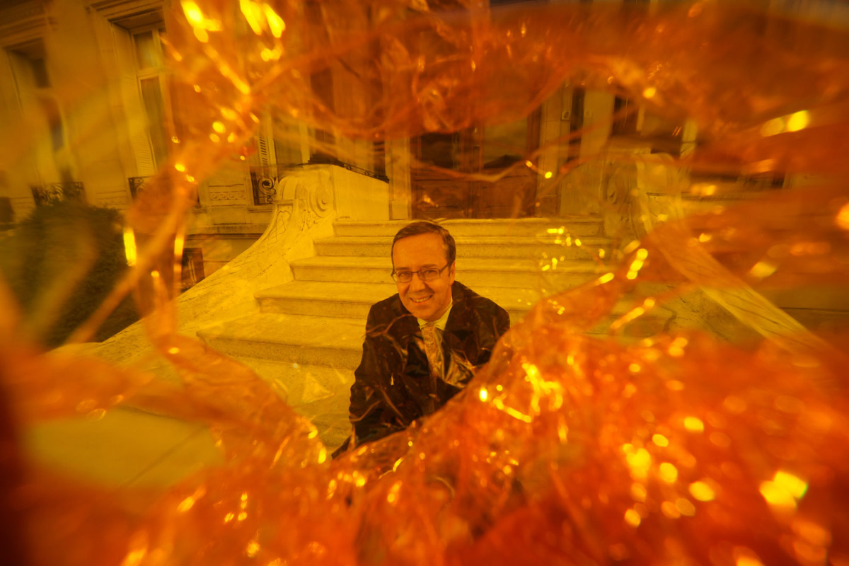 Frédéric sits on the steps of his family home in Reims. The lens has been rapped in the famous cellophane of Chrystal