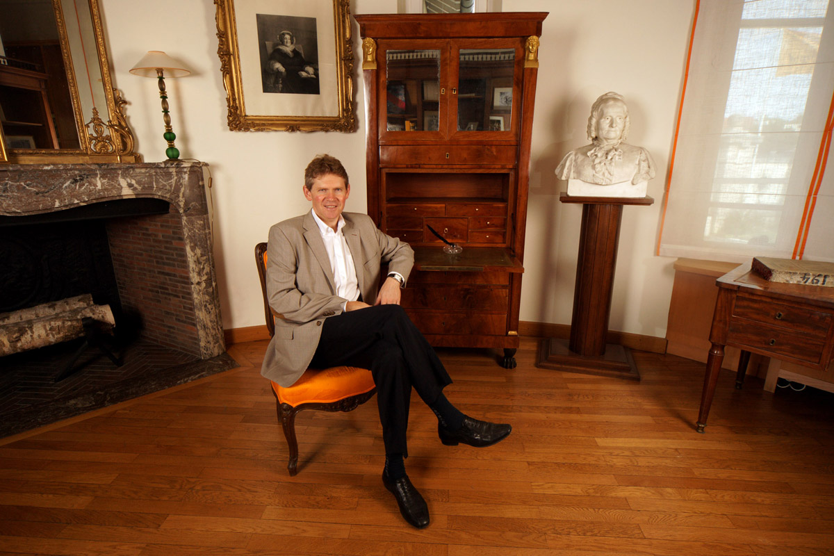 The eye is immediately drawn to the unmistakable orange of Veuve Clicquot in the chair cover. Dominique sits by the old writing desk used by Mme Clicquot herself; her bust and portrait behind him further tying in the past and the present.